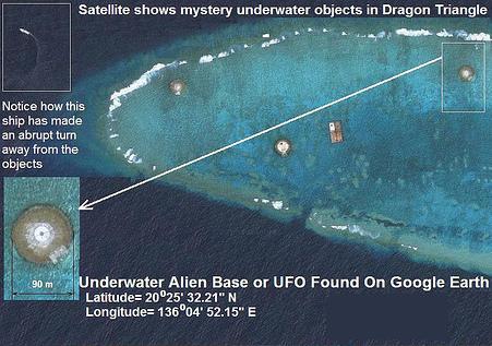 Kasnih 1940-ih japanska je vlada zbog velikog broja nestalih brodova, proglasila ovo područje opasnim. 1950 poslali su ekspediciju da istraže područje te da otkriju što je uzrok tolikim nesrećama. Unatoč lijepom vremenu i mirnom moru, istraživački brod Kiao Maru Br.5 nestao je bez traga 1952. Živote su izgubili 9 istraživača i 22 člana posade. Brod nikada nije pronađen. Danas se smatra da izvanzemaljci uzrokuju ove nesreće. Na gornjoj slici možete vidjeti satelitsku snimku neobičnih objekata pod morem. Smatra se da su to izvanzemaljski brodovi. U gornjem lijevom uglu simljen je brod kako se okreće od tih objekata.